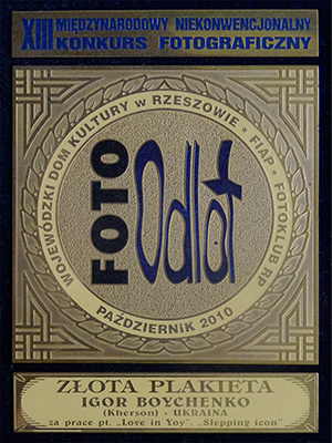 - Серебряная медаль FIAP на конкурсе нетрадиционной фотографии "Foto Odlot", Польша (Foto Odlot International unconventional photo competition), 2011.