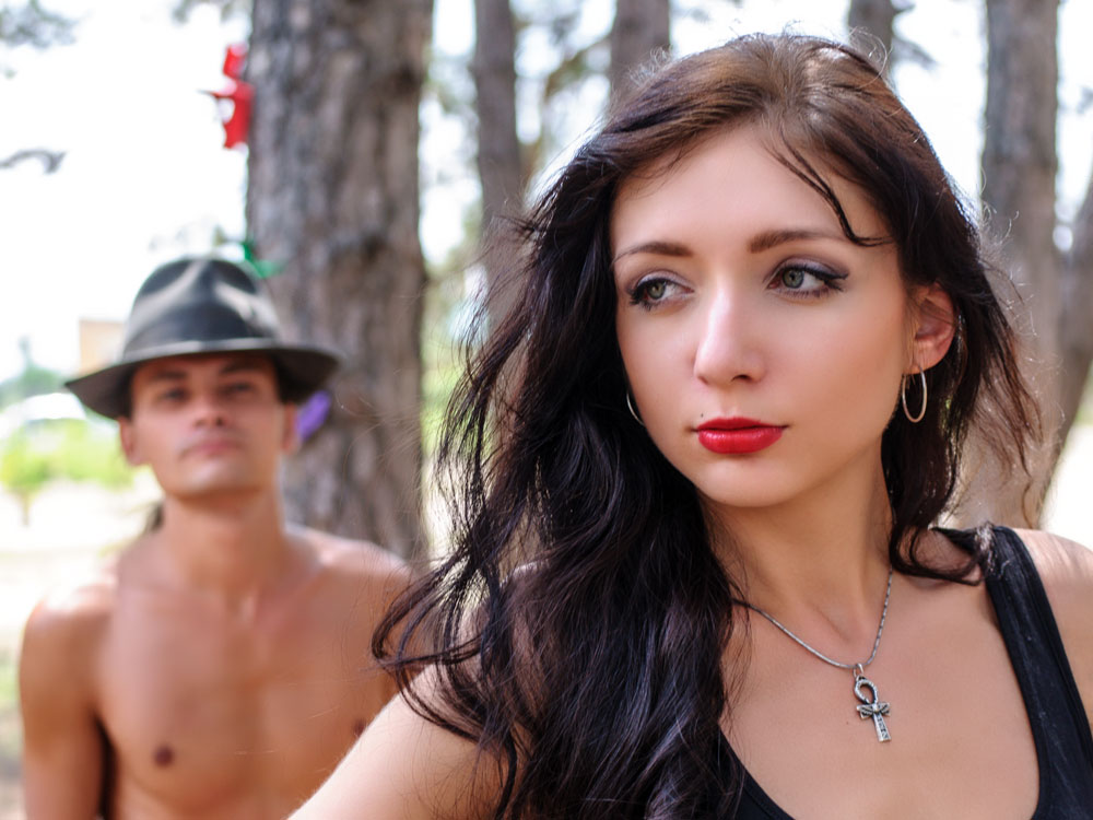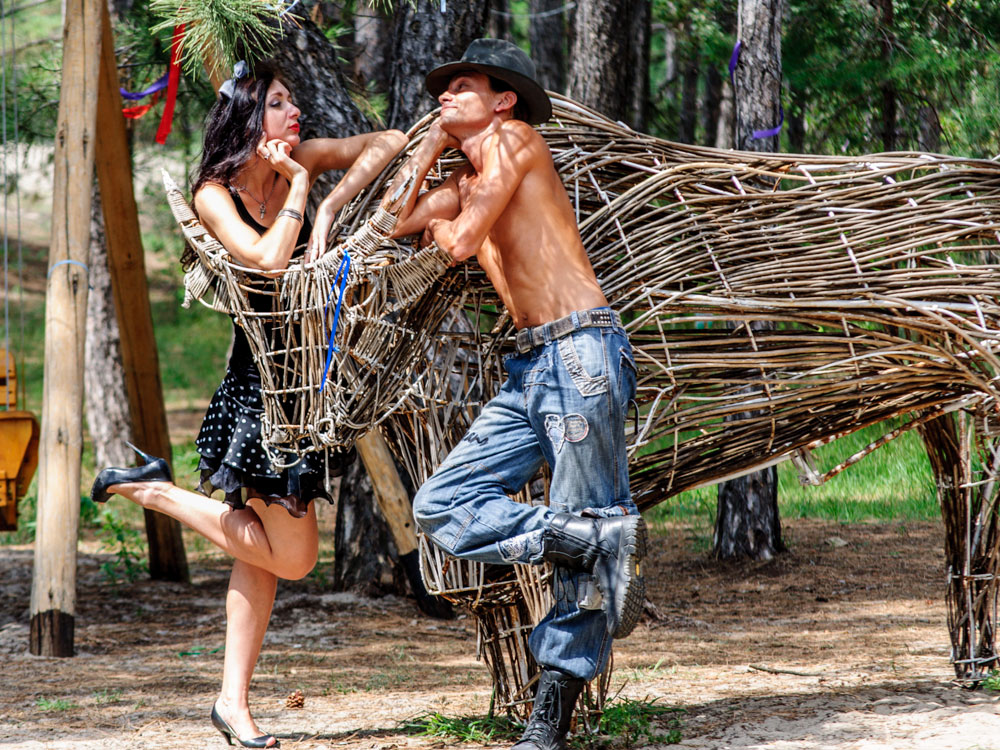 Итак, играем! В барышню и хулигана. Она — такая изящная и утонченная, он — брутальный и непредсказуемый. Она — образец правильности, он — отрицание всяких правил. Она элегантно опускается на простую деревянную скамеечку, он же играет мускулами и готов к действию — ну хотя бы оседлать соломенного бычка (в отсутствии других).